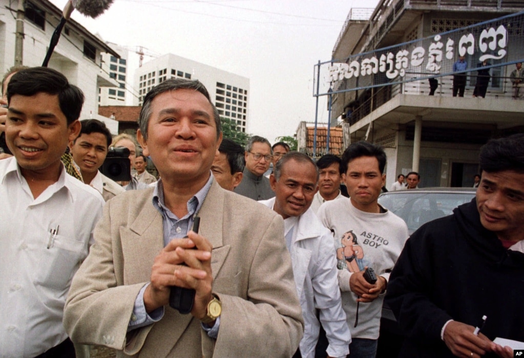 Kem Sokha, former chairman of the Cambodian parliament's human rights commission, center, greets the press as he leaves the Phnom Penh Municipal Court in Cambodia Tuesday, Dec. 15, 1998. (Ou Neakiry | AP)