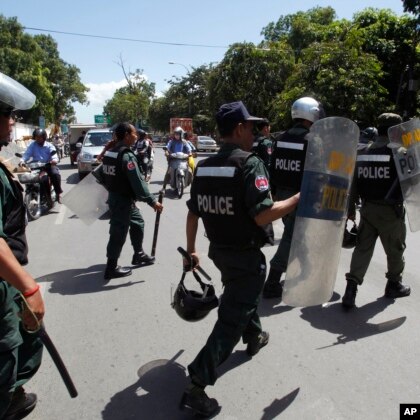 Cambodian riot police officers walk towards workers gathering in front of National Assembly in Phnom Penh, Cambodia, Tuesday, June 30, 2015. (AP)