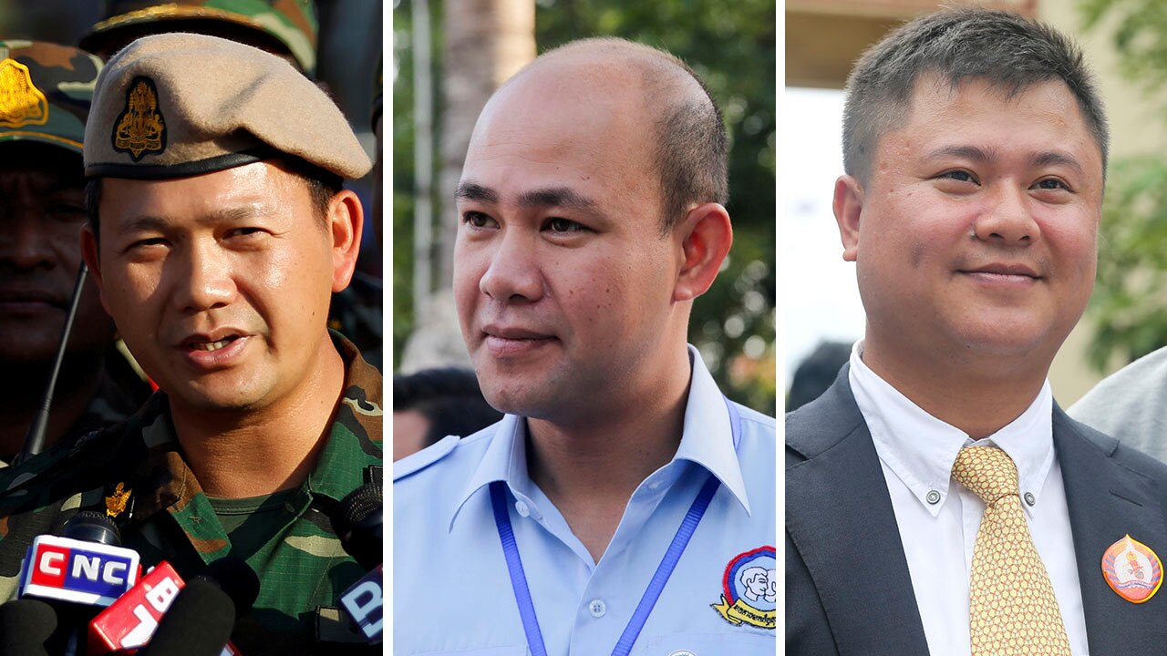 Hun Sen's children are seen as possible successors. Left: Hun Sen’s oldest son, Hun Manet, was recently promoted to deputy commander-in-chief of the Royal Cambodian Armed Forces. Middle: Hun Many is a CPP member of parliament. Right: Hun Manith is an army brigadier-general. Not pictured: Hun Mana, controls a major media company. (VOA News)