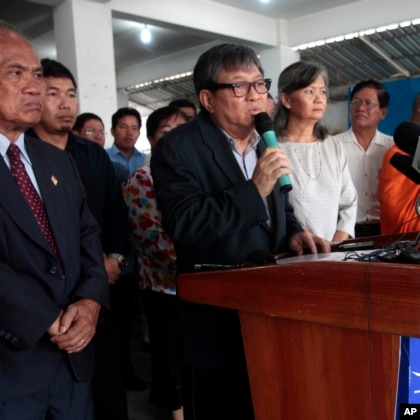 Cambodia National Rescue Party (CNRP) lawmakers, Son Chhay, center left, Mu Sochua, center right, together lead a press conference at the party headquarters, in Phnom Penh, Cambodia, Tuesday, Sept. 12, 2017. CNRP on Tuesday held a press conference, saying they remain determined to participant the upcoming general election in July 2018. Prime Minister Hun Sen, on Monday, Sept. 11, threatens to dissolve the main opposition party if it gets involved in legal proceedings against its chief, who was charged with treason last week. (Heng Sinith | AP)
