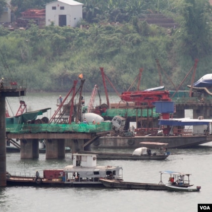 ការដ្ឋានសាងសង់​ស្ពាន​នៅស្រុកស្ទឹងត្រង់ ខេត្តកំពង់ចាម តាមដងទន្លេមេគង្គកំពុង​ត្រូវបាន​ធ្វើឡើង​ក្រោម​ប្រាក់កម្ចីពីប្រទេស​ចិនចំនួន​៥៧លានដុល្លារ។ (អូន ឆេងប៉រ | VOA Khmer)
