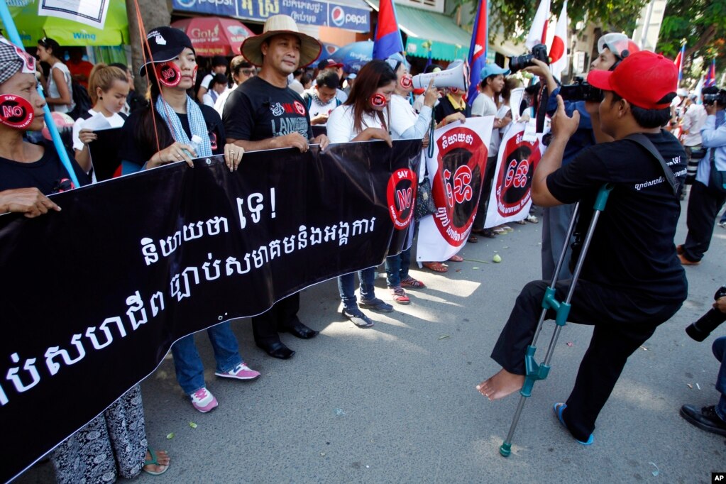 “រូបឯកសារ៖ អ្នក​ថតរូប​ពិការ​ជើង​ម្នាក់ (ស្តាំ) កំពុង​ថតរូប​អ្នក​តវ៉ា​ដែល​កាន់​បដា​សរសេរ​ថា «និយាយា​ថា ទេ! ច្បាប់​សហជីព ច្បាប់​សមាគម​និង​អង្គការ‍» ក្នុង​​អំឡុងពេល​នៃ​ការ​តវ៉ា​មួយ​នៅ​ខាង​មុខ​​អគារ​ព្រឹទ្ធសភា ដែល​សមាជិក​ព្រឹទ្ធសភា​បាន​បោះឆ្នោត​លើ​សេចក្តីព្រាងច្បាប់​​សមាគម​និង​អង្គការ រាជធានី ភ្នំពេញ ថ្ងៃ​សុក្រ ទី​២៤ ខែ​កក្កដា ឆ្នាំ​២០១៥។ សមាជិក​ព្រឹទ្ធសភា​នៃ​គណបក្ស​ប្រជាជន​កម្ពុជា​ដែល​ជា​គណបក្ស​កាន់​អំណាច បាន​អនុម័ត​លើ​​សេចក្តីព្រាង​ច្បាប់​ដ៏​ចម្រូងចម្រាស​មួយ​កាល​ពី​ថ្ងៃ​សុក្រ ដែល​រឹតត្បិត​យ៉ាង​ខ្លាំង​ទៅ​លើ​អង្គការ​សង្គមស៊ីវិល​ទាំង​អស់​នៅ​ក្នុង​ប្រទេស​កម្ពុជា និង​ផ្តល់​អំណាច​ពេញលេញ​ដល់​រដ្ឋាភិបាល​ក្នុង​​ការ​រឹតត្បិត​រាល់​សកម្មភាព​របស់​អង្គការ​សង្គម​ស៊ីវិល ដែល​ខ្លួន​យល់​ថា​គំរាម​កំហែង​ដល់​សន្តិសុខជាតិ។” (Heng Sinith | AP)
