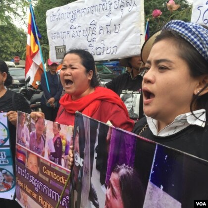 រូបឯកសារ៖ អ្នកស្រី បូវ សោភា និង កញ្ញា សុង ស្រីលាភ ដែលជាសកម្មជនដីធ្លីនៅសហគមន៍បឹងកក់ ស្រែករកយុត្តិធម៌នៅមុខតុលាការកំពូល នៅថ្ងៃទី ២៧ ខែ កុម្ភៈ ឆ្នាំ ២០១៧។ (ហ៊ុល រស្មី | VOA Khmer)