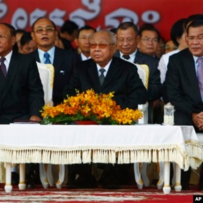 From left: រូបឯកសារ៖ លោក ហេង សំរិន ប្រធានរដ្ឋសភាជាតិ លោក ជា ស៊ីម ប្រធានព្រឹទ្ធសភាជាតិ លោក ហ៊ុន សែន នាយករដ្ឋមន្ត្រីកម្ពុជា ចូលរួមប្រារព្ធទិវា៧មករា នៅរាជធានីភ្នំពេញ កាលពីថ្ងៃទី៧ ខែមករា ឆ្នាំ២០១៤។ លោក សុខ ឥសាន ជឿថា ថ្នាក់ដឹកនាំគណបក្សប្រជាជនកម្ពុជាដែលភាគច្រើនជា អតីតកម្មាភិបាលខ្មែរក្រហម បានជួយឲ្យលោក និងប្រជាជនកម្ពុជាជាច្រើនលាន នាក់រួចផុតពីសេចក្តីស្លាប់។ (AP)