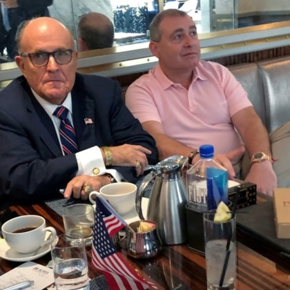 FILE — Rudy Giuliani, left, U.S. President Donald Trump's personal lawyer, has coffee with Ukrainian American businessman Lev Parnas at the Trump International Hotel in Washington, D.C., Sept. 20, 2019. (Reuters)