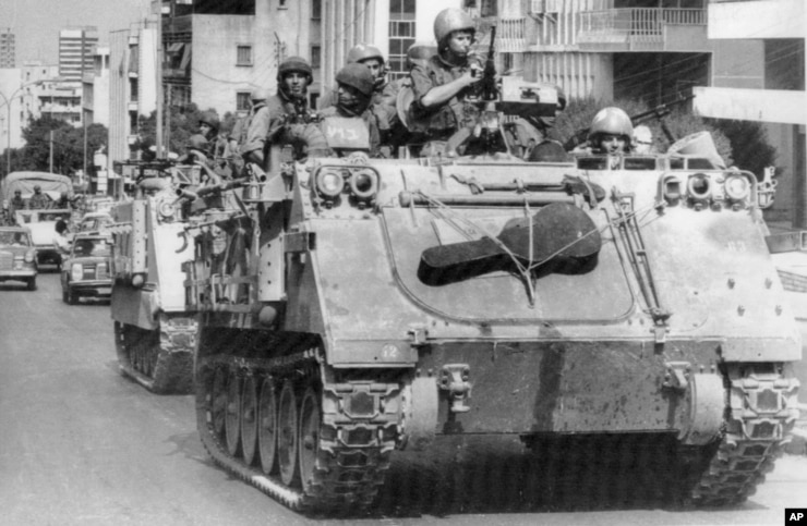 ستمبر 28، 1982 کی اس فائل فوٹو میں اسرائیلی ٹینک مغربی بیروت کی بندرگاہ کے علاقے سے نکلنے کے بعد سڑکوں سے گزرتے ہوئے نظر آرہے ہیں۔ (اے پی)