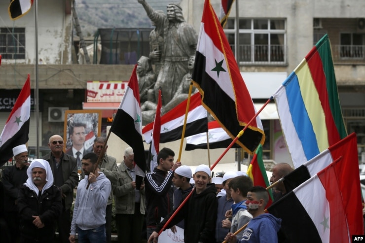 مارچ 2019 میں گولان ہائٹس کے مکین شامی صدر بشار الاسد کی تصویر اٹھائے شامی اور دروز پرچم لہراتے ہوئے امریکہ کی جانب سے گولان پر اسرائیلی دعوے کی حمایت کے خلاف احتجاج کر رہے ہیں۔ (اے پی)