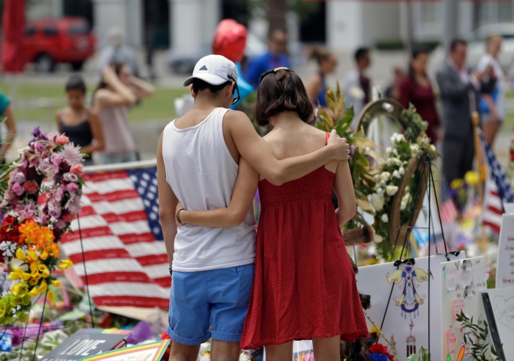 A couple observe a makeshift memorial honoring the victims of the Pulse nightclub mass shooting, June 20, 2016, in Orlando, Fla. (AP)