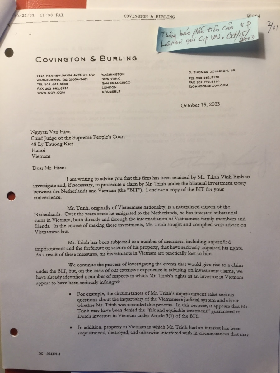 Trong thư gửi cho Chánh án TAND Tối cao Nguyễn Văn Hiện, Luật sư của Covington & Burlington cho biết họ “xác định được rất nhiều quyền lợi của ông Trịnh, quyền của nhà đầu tư vào Việt Nam bị vi phạm nghiêm trọng.” Chẳng hạn như “ông Trịnh đã bị tước đoạt quyền được ‘đối xử bình đẳng và công bằng’ cho nhà đầu tư Hà Lan tại Việt Nam theo điều khoản 3(1) của Hiệp ước quy định.”